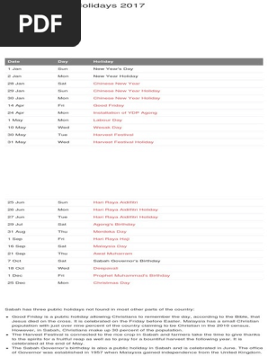 Public holidays calendar 2017 (kalendar cuti umum 2017). Kalendar cuti umum negeri sabah 2021. Kalender cuti 2017 jadual cuti umum di malaysia. Kalendar percutian cuti umum sabah 2020, malaysia mendedahkan semua orang awam, rasmi, persekutuan, bank & kerajaan cuti tahun 2020 yang akan diraikan oleh rakyat negeri. Untuk pengetahuan, terdapat 2 helai yang disediakan iaitu helaian pertama kalendar dan helaian kedua ialah makluman cuti 2017.