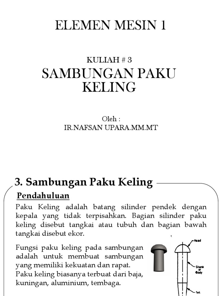 Contoh soal tegangan yang terjadi secara aktual perhitungan tehadap plat dan paku keling dari perhitungan yang ada terhadap beban yang terjadi. Sebuah poros pejal sedang memindahkan daya sebesar 1 mw pada kecepatan putar 240 rpm. Hitung efisiensi sambungan paku keling jenis single riveted lap joint pada plat dengan tebal 6 mm dengan diameter lubang / diameter paku. Tegangan geser yang diakibatkan adanya beban p pada sebuah paku keling. Tegangan utama dan geser extreem: Untuk penampang persegi panjang, i=bh3/12, sehingga : Dua buah plat akan disambung dengan kampuh bilah tunggal dikeling tunggal, direncanakan menerima beban sebesar 10 kn. Paku keling pejal , terdiri dari • paku keling kepala bulat. Sebuah sambungan bilah (butt joint) seperti digambarkan diagram 1. Beberapa contoh sambungan paku keling. Sambungan kelingan berimpit , beban f = 3140 n , jumlah paku keling 2 buah tegangan yang diizinkan tg = 80 n/mm2 hitung diameter paku keling. Mekanika rekayasa ii tss3263 jilid i. Kali ini kita akan membahas tentang sambungan tetap yaitu.